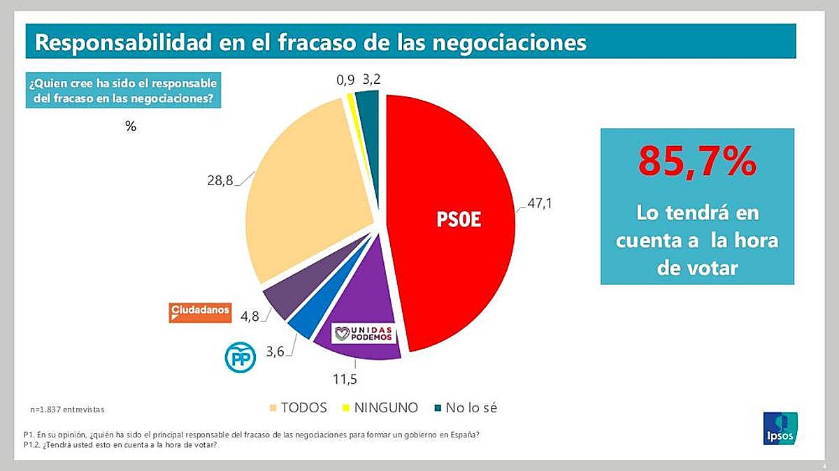 El sondeo, realizado justo después de anunciarse la repetición de las elecciones, señala al PSOE de Pedro Sánchez como el gran responsable del fracaso en las negociaciones. El 47% de los encuestados apunta a Pedro Sánchez, pero hay casi un 30% de votantes que coinciden en que todos los políticos han puesto su granito de arena para llegar al extremo de tener que repetir las elecciones.