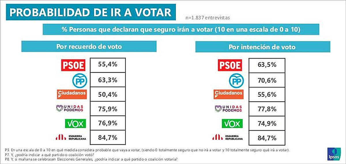 La percepción que tienen los encuestados por Ipsos es que el PSOE será el partido que sufrirá una mayor abstención el 10 de noviembre: un 23% menos de votos según lo respondido por quienes votaron al PSOE en abril respecto a lo que harán en noviembre. Lógicamente, los propios votantes del PSOE son los menos pesimistas respecto a la abstención. Quienes confirman su intención de voto socialista para noviembre interpretan que el partido con más razones para el desencanto será Unidas Podemos.
