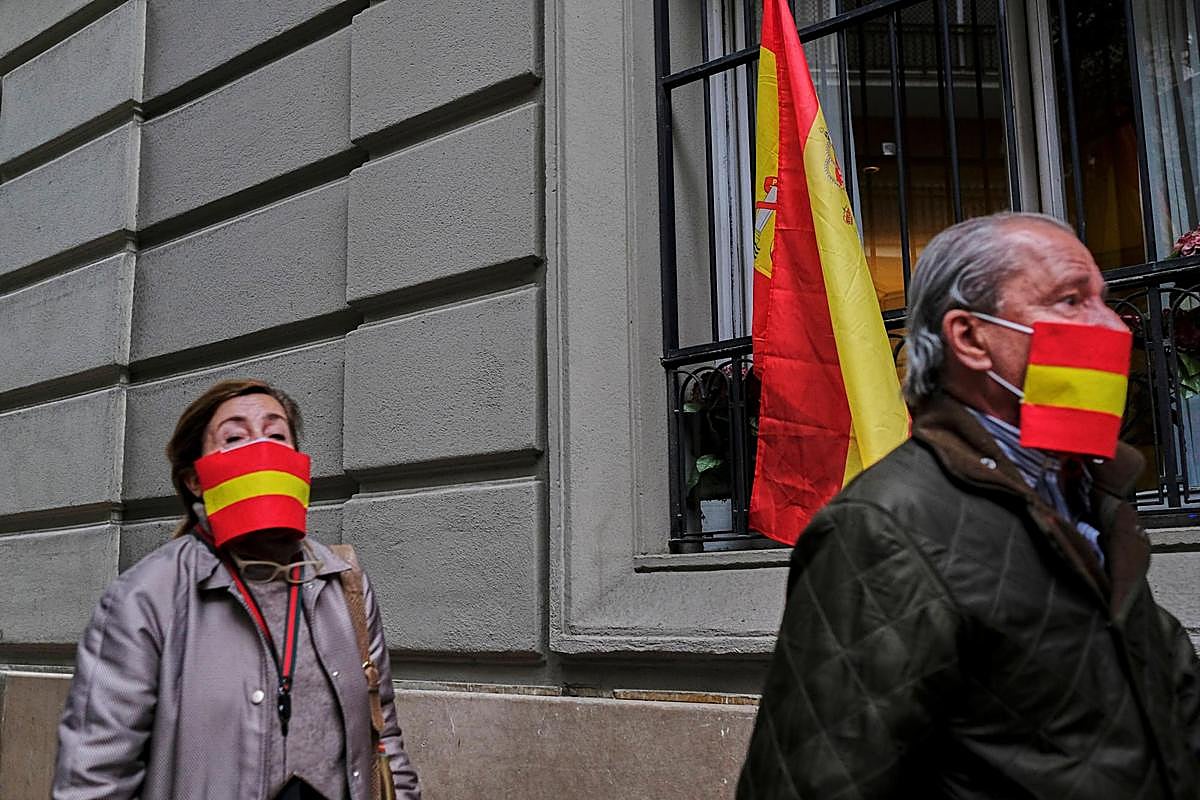 Este jueves, han vuelto a salir a la calle con banderas de España, algunas de ellas preconsitucionales, y haciendo sonar cacerolas al grito de "libertad". Asimismo, han repartido tarjetas con la cara del presiente del Gobierno en las que se podía leer 'Confía en tu Gobierno. Encerrados sois libres'.