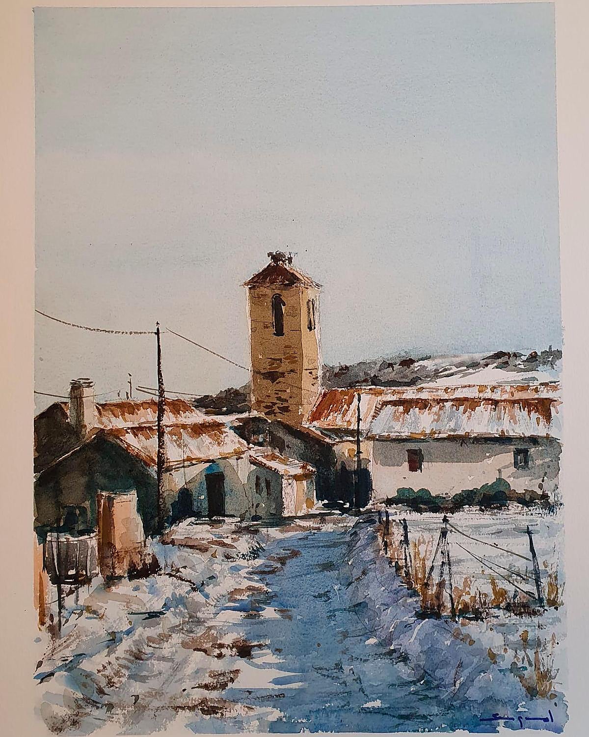 Los atardeceres y amaneceres que acompañan los desplazamientos diarios en su trabajo como veterinario, los campanarios de las iglesias, las calles de los pueblos, los campos en primavera, los horizontes nevados en invierno, todo eso y mucho más inspira a Jordi Sangenís a la hora de plasmarlo en sus acuarelas.
