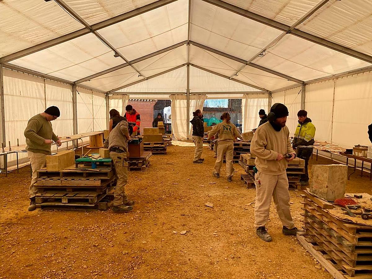 Estudiantes y docentes pertenecen a la escuela de formación continua de artes y oficios francesa “Les Compagnons du Devoir et du Tour de France”, y su trabajo se desarrolla estos días en una carpa instalada en la zona de El Salinar. Allí miden y tallan las piezas que después montarán en la bóveda que están elaborando.