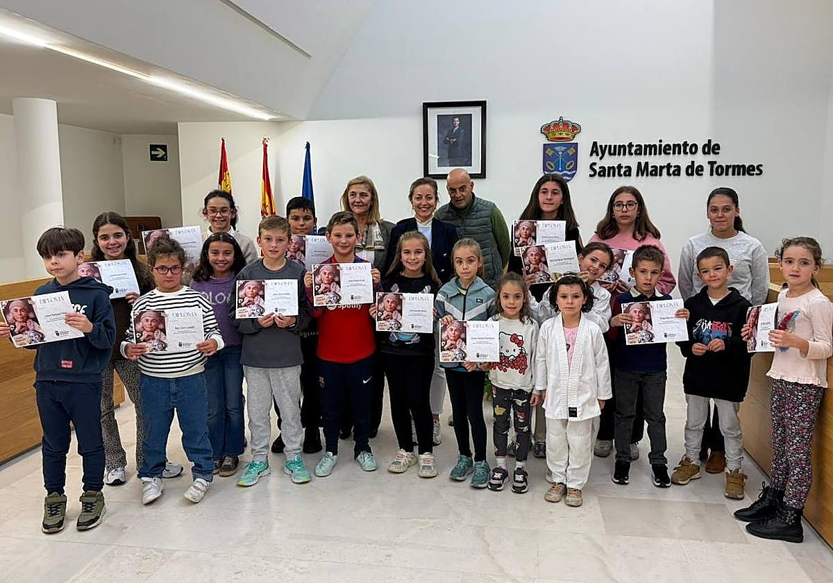 Los concejales de Educación y Turismo y Comercio, Juani Rubio y Juan Carlos Bueno, respectivamente han recibido en el Ayuntamiento de Santa Marta de Tormes a los niños que han participado en el concurso 'Un Collage con Martín Gaite'.