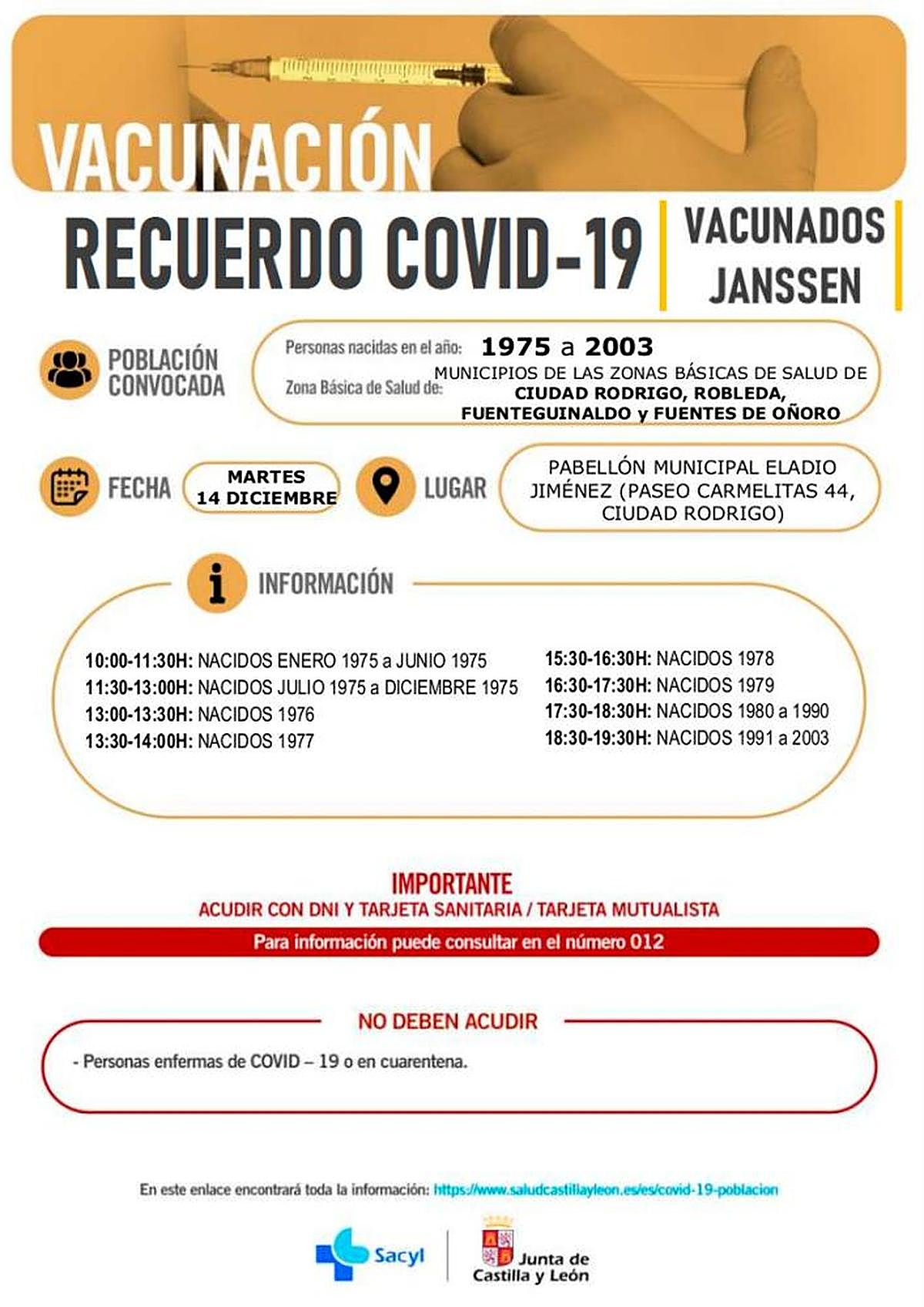 Los vecinos de las zonas básicas de salud de Ciudad Rodrigo, Robleda, Fuenteguinaldo y Fuentes de Oñoro nacidos entre 1920 y 1974, que se vacunaron con esta vacuna, tendrán que volver a hacerlo el martes 30 de noviembre entre las 10 de la mañana y las 7 y media de la tarde en el pabellón municipal Eladio Jiménez de Ciudad Rodrigo.
