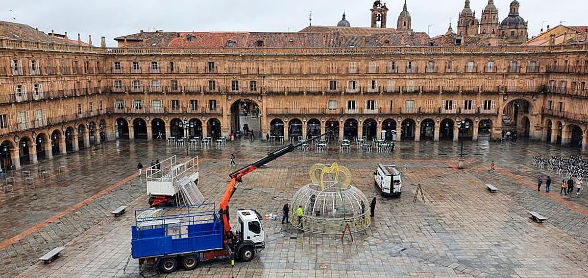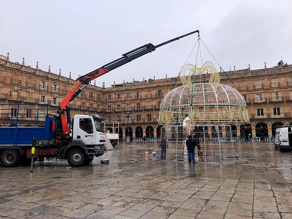Los preparativos de cara a las fechas navideñas se suceden en la capital del Tormes. Si bien las luces que iluminarán las calles llevan instaladas varias semanas, este lunes ha sido el turno para uno de los atractivos para los charros y visitantes de Salamanca: la decoración navideña de la Plaza Mayor.