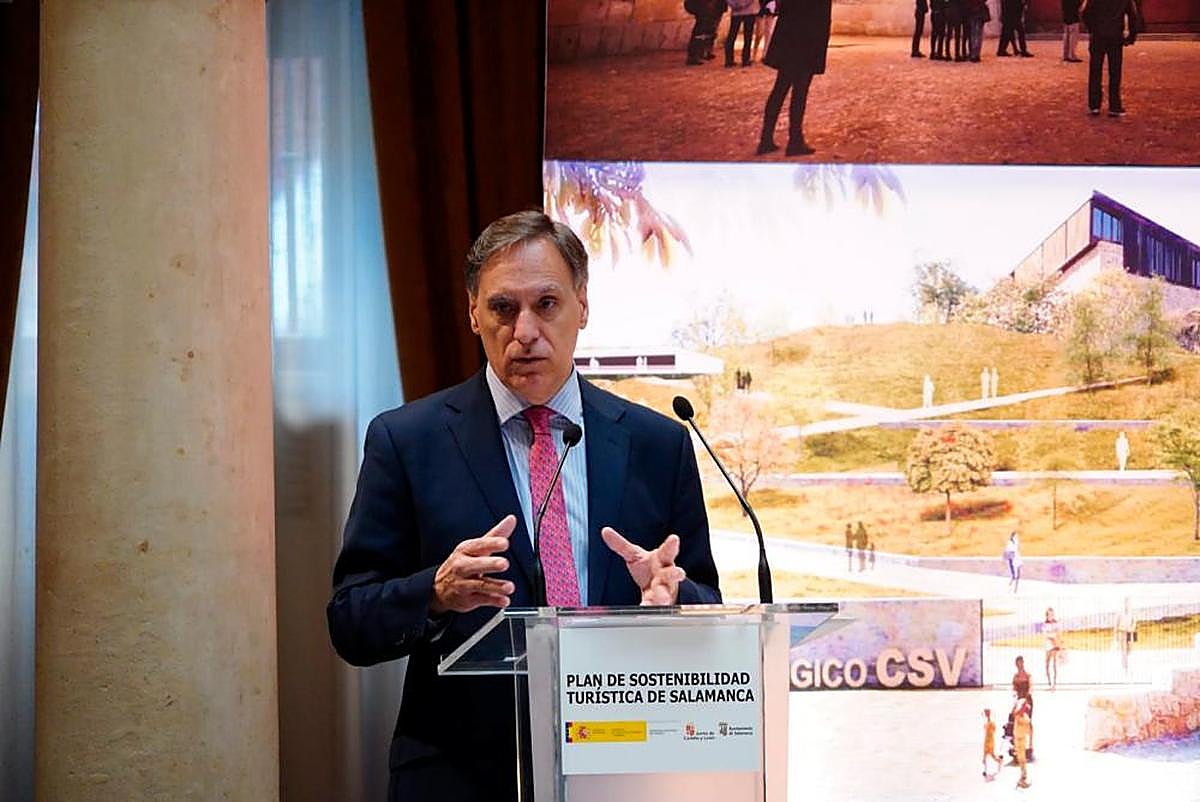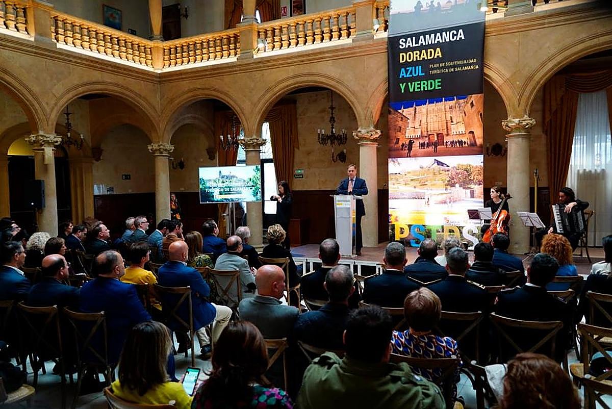 El alcalde de Salamanca, Carlos García Carbayo, ha presentado esta mañana el primer Plan de Sostenibilidad Turística: ‘Salamanca dorada, verde y azul’, con el objetivo de impulsar una de las “piezas claves de la economía local que constituye una importante fuente de empleo”, que contará con una inversión de 4,9 millones de euros y un plazo de ejecución de tres años. Un plan, continuó el regidor municipal, que está cofinanciado al 33 por ciento por el Ayuntamiento de Salamanca, la Junta de Castilla y León y el Gobierno de España, y que será ampliado hasta superar los 9 millones de euros.
