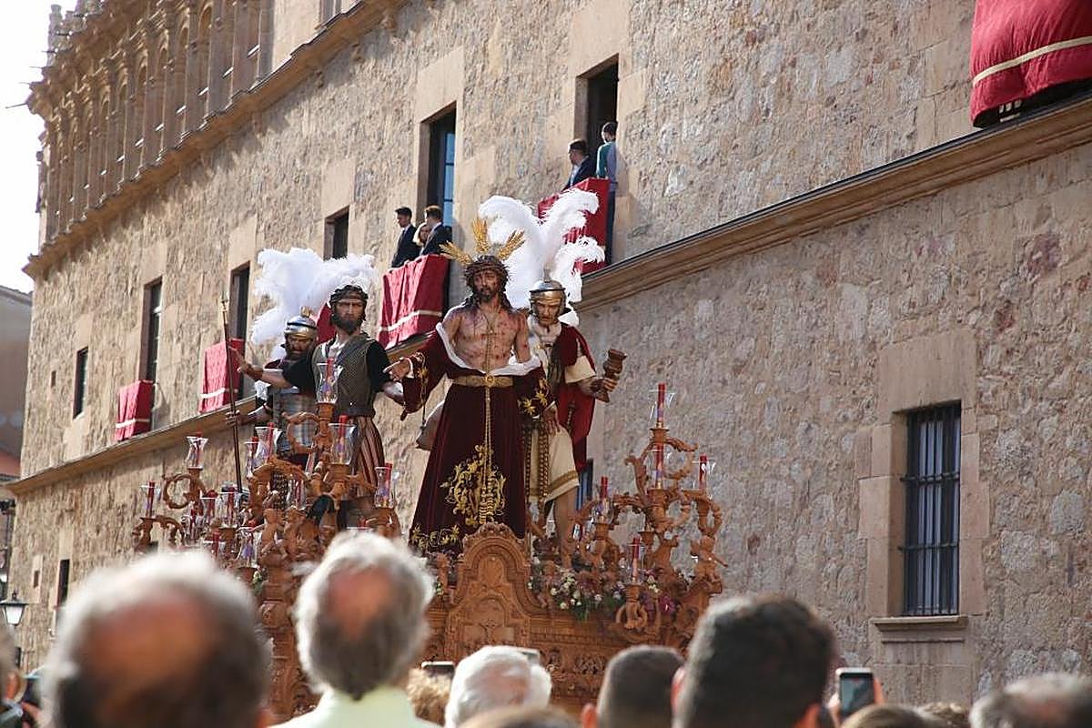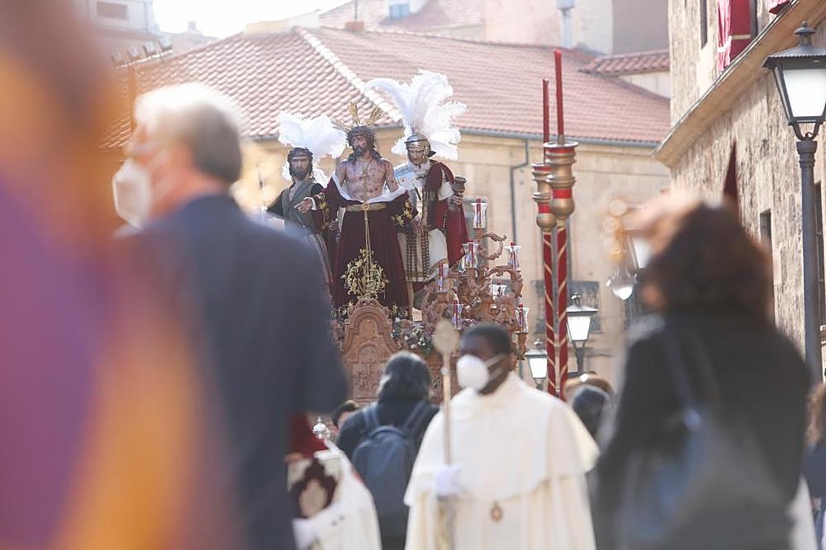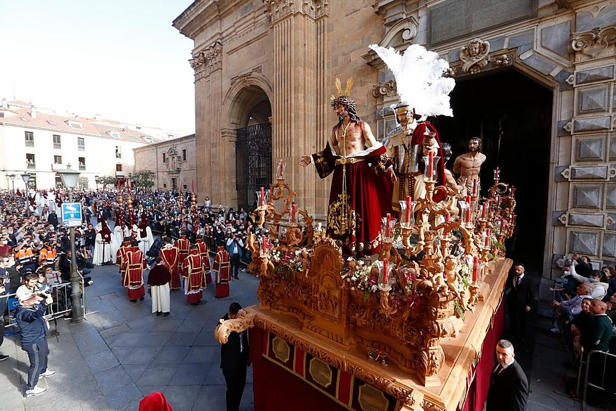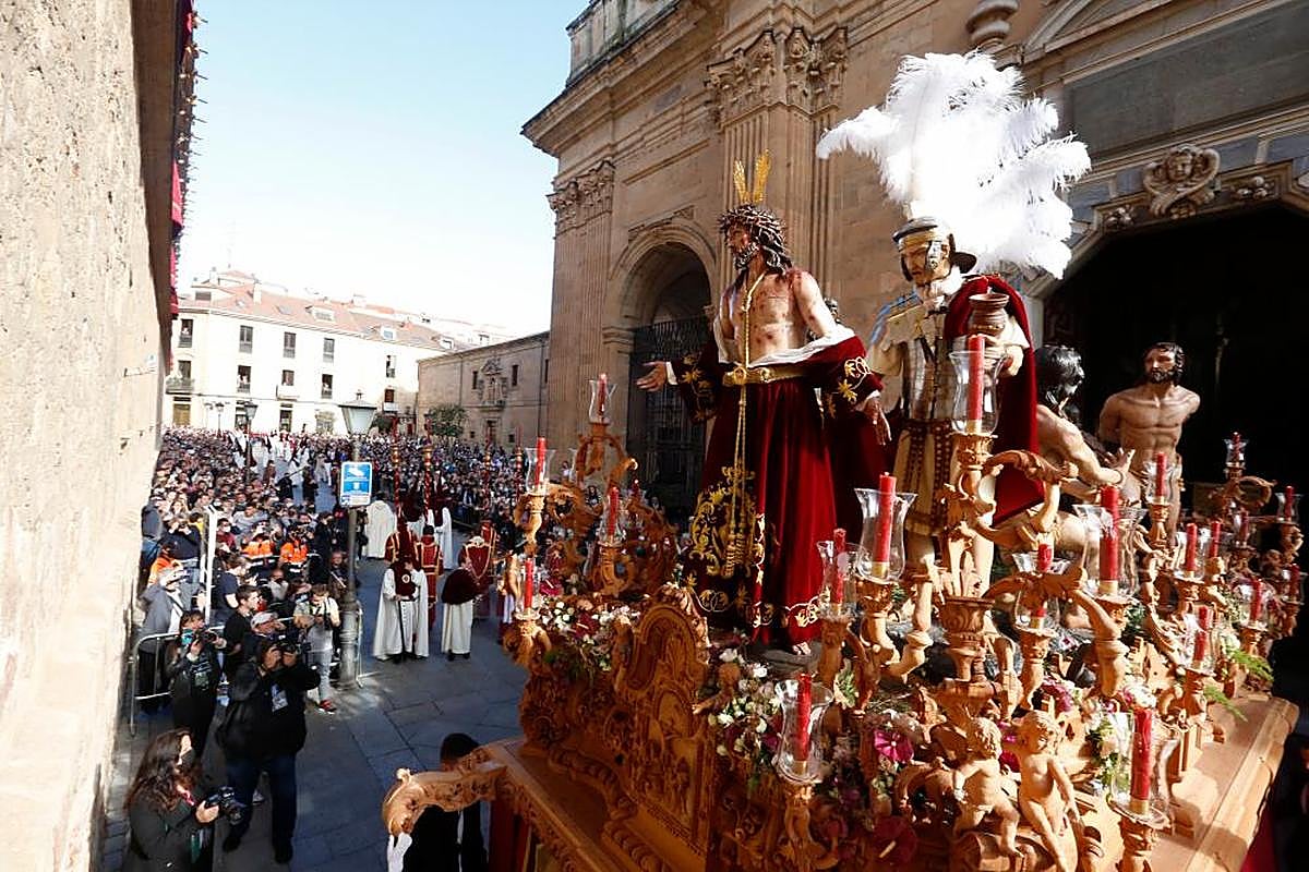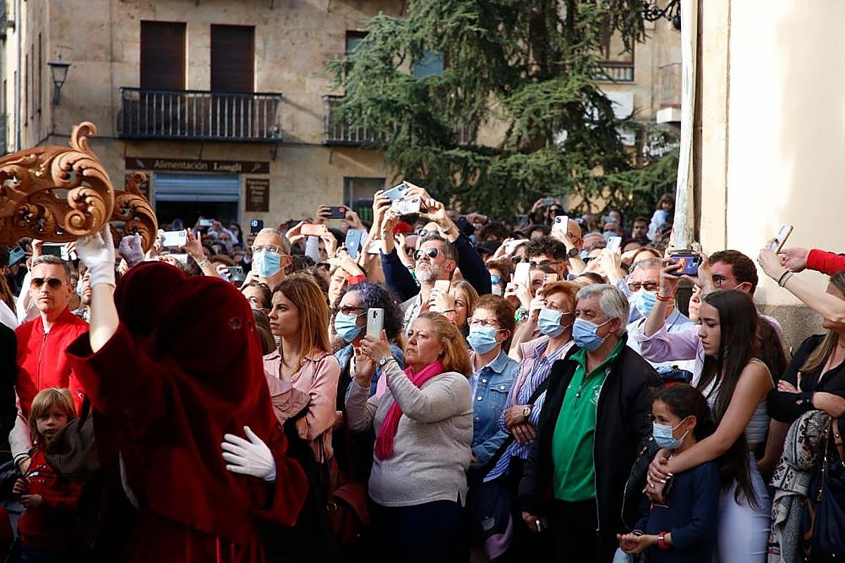 La primera ‘levantá’ ha sido tremendamente emocionante, un silencio abrumador que dio paso a un “ay que bonito está” de algunos de los que se encontraban cerca. Ha sido entonces cuando la imagen ha arrancado camino de la esquina de la calle Compañía. Junto al Padre Jesús Despojado, la Virgen de la Caridad bajo palio que ha sido recibida con pétalos en su salida —junto a la Banda de Alba de Tormes— ha acompañado a la imagen.