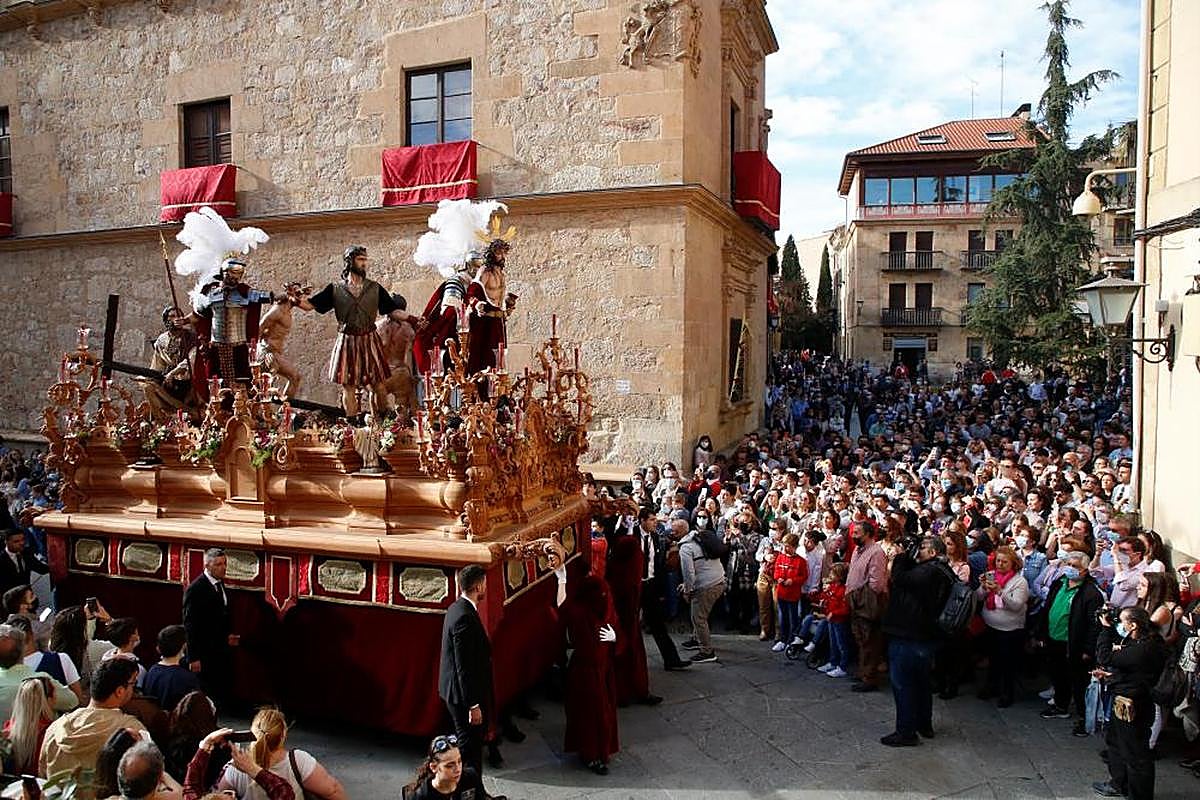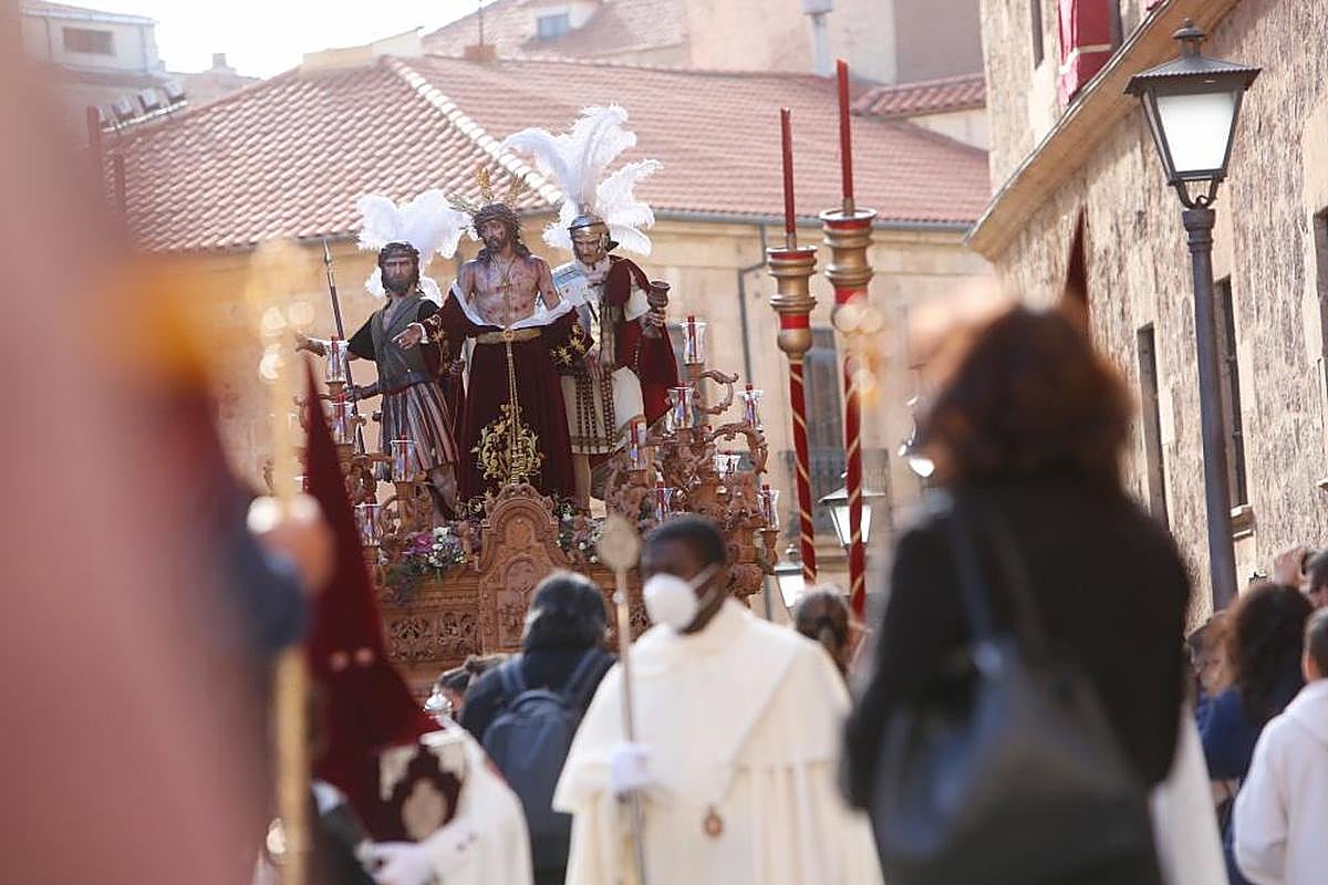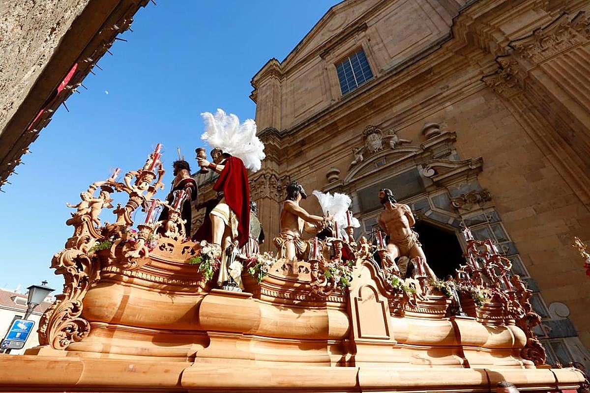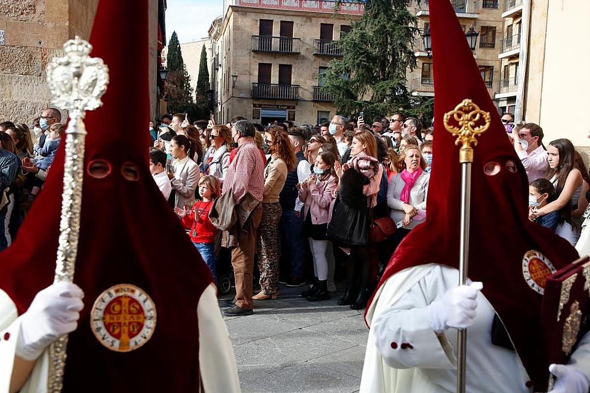 La primera ‘levantá’ ha sido tremendamente emocionante, un silencio abrumador que dio paso a un “ay que bonito está” de algunos de los que se encontraban cerca. Ha sido entonces cuando la imagen ha arrancado camino de la esquina de la calle Compañía. Junto al Padre Jesús Despojado, la Virgen de la Caridad bajo palio que ha sido recibida con pétalos en su salida —junto a la Banda de Alba de Tormes— ha acompañado a la imagen.