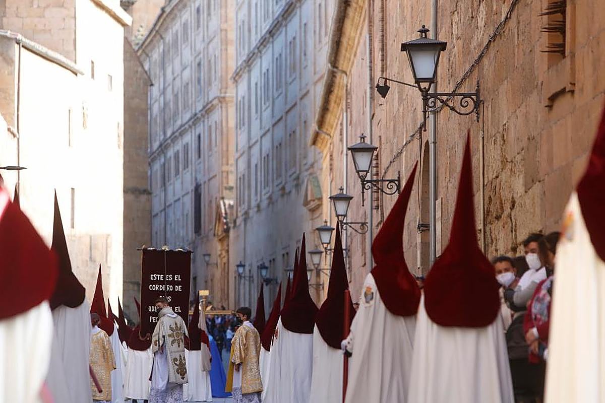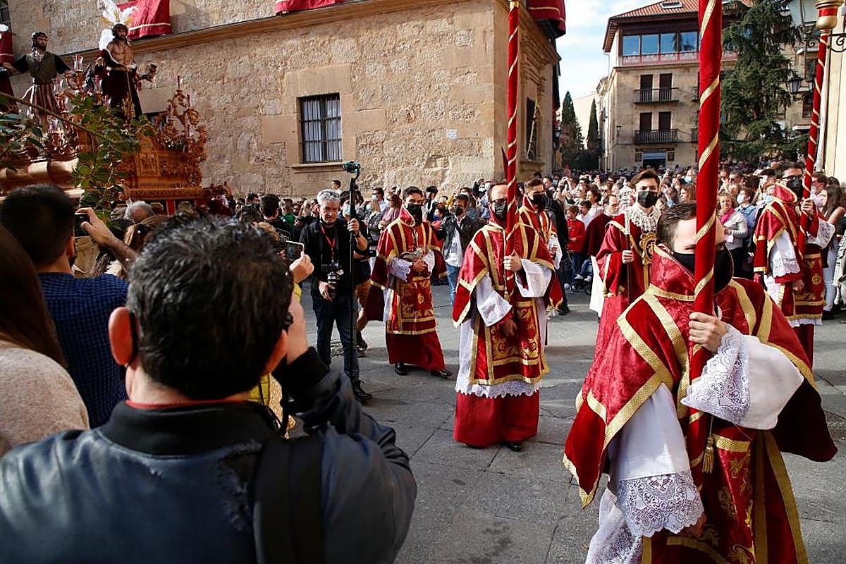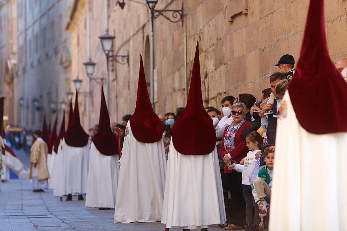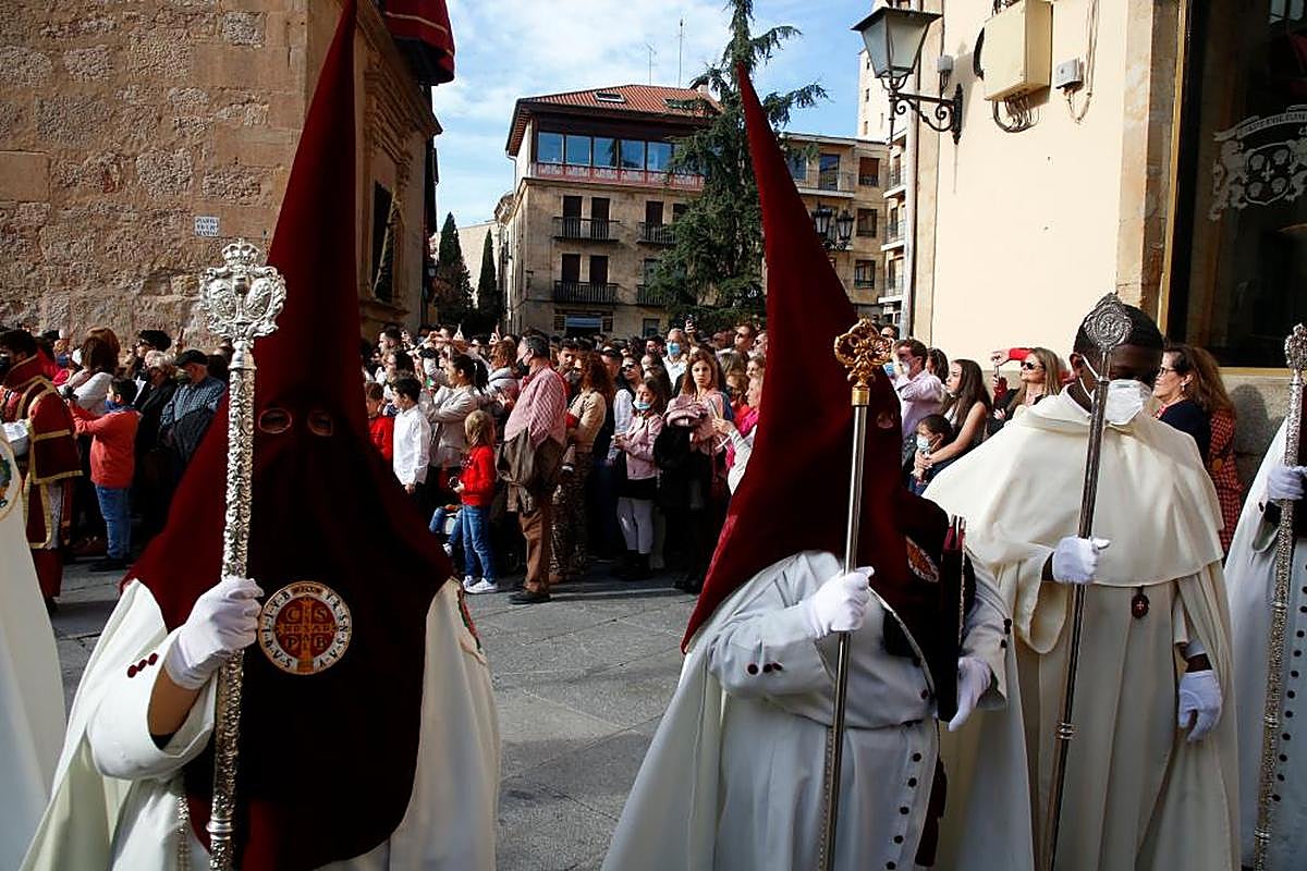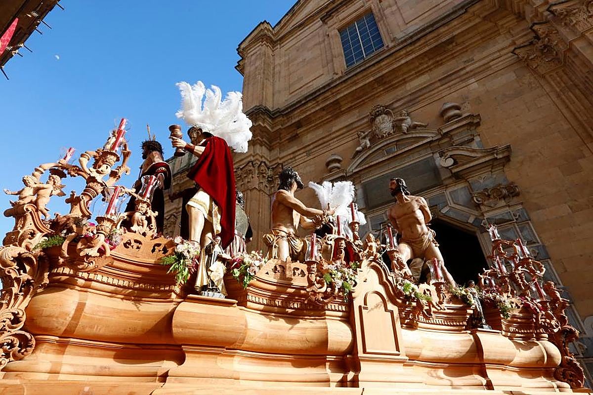 La primera ‘levantá’ ha sido tremendamente emocionante, un silencio abrumador que dio paso a un “ay que bonito está” de algunos de los que se encontraban cerca. Ha sido entonces cuando la imagen ha arrancado camino de la esquina de la calle Compañía. Junto al Padre Jesús Despojado, la Virgen de la Caridad bajo palio que ha sido recibida con pétalos en su salida —junto a la Banda de Alba de Tormes— ha acompañado a la imagen.