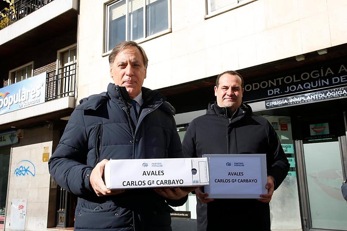 El alcalde de Salamanca, Carlos García Carbayo ha presentado en la sede del grupo popular los 1185 avales que por ahora ha conseguido para su precandidatura a presidir el partido popular Salamanca.