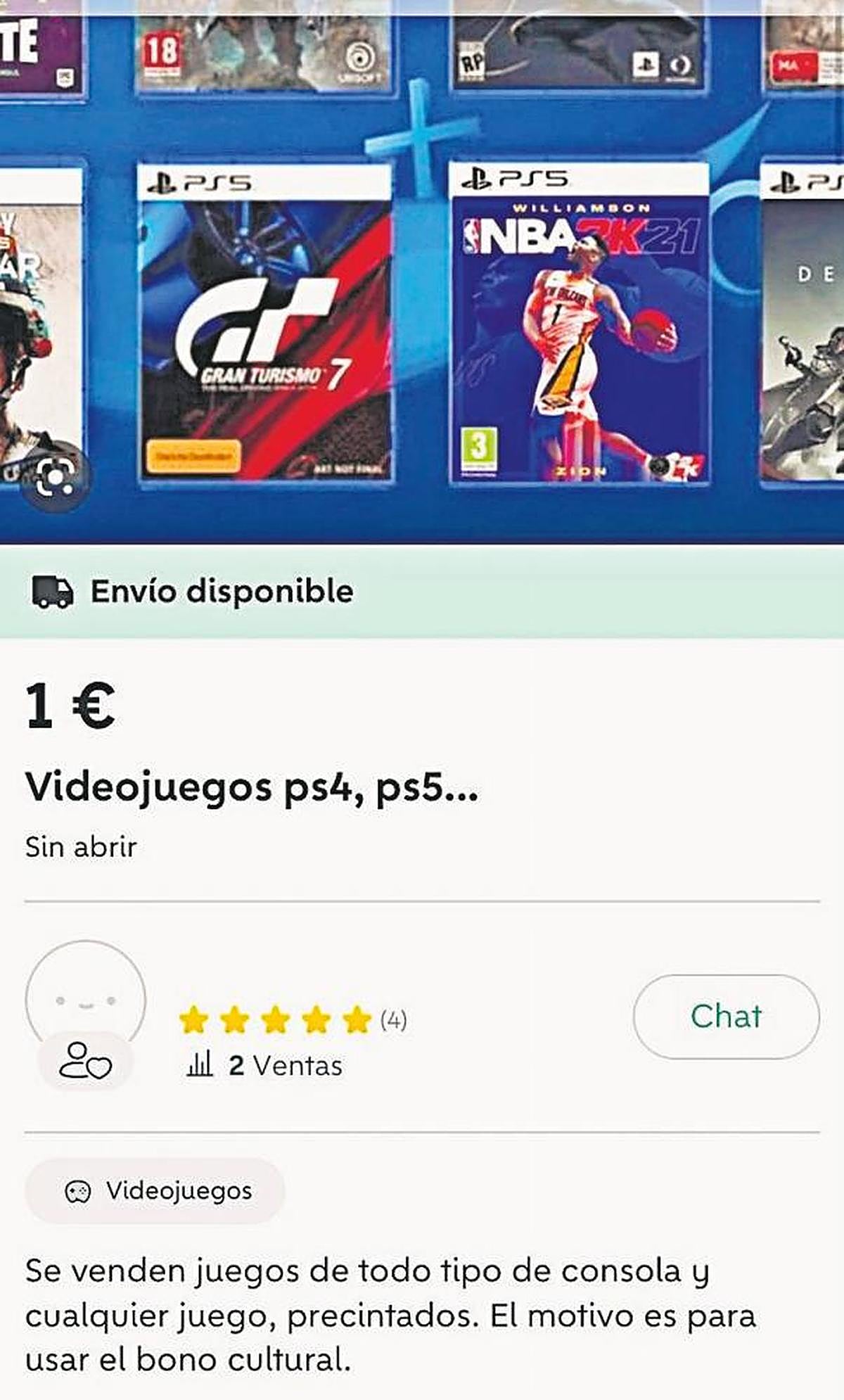 “Se venden juegos precintados de todo tipo de consolas. El motivo es para usar el Bono Cultural”, son anuncios ‘sin tapujos’ que contienen las descripciones de algunos productos en venta en las plataformas de segunda mano. Como este mensaje, otros jóvenes de 18 años que se han beneficiado de los 400 euros de la ayuda del Gobierno para obtener productos culturales, están revendiendo los artículos adquiridos para lograr así dinero en efectivo.