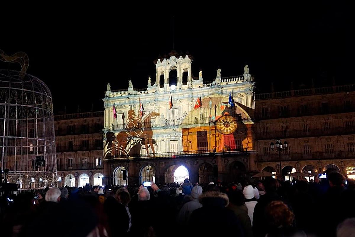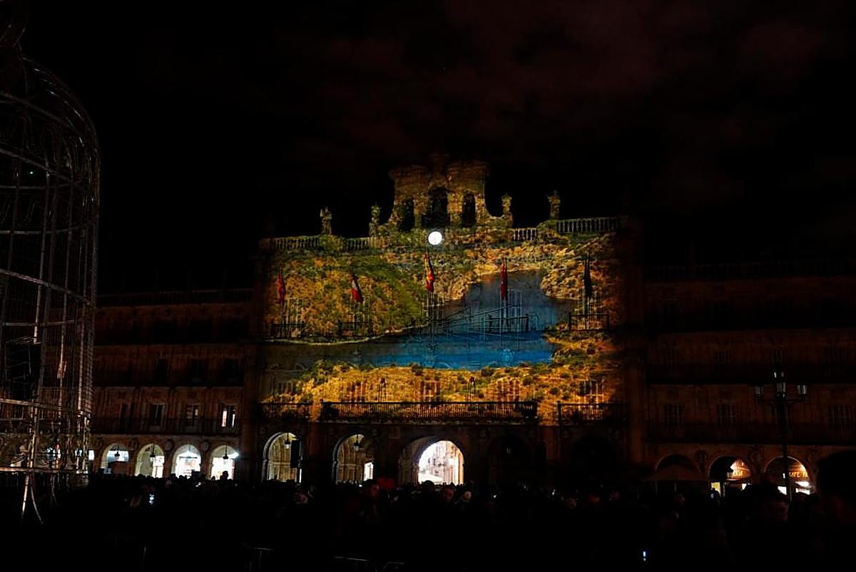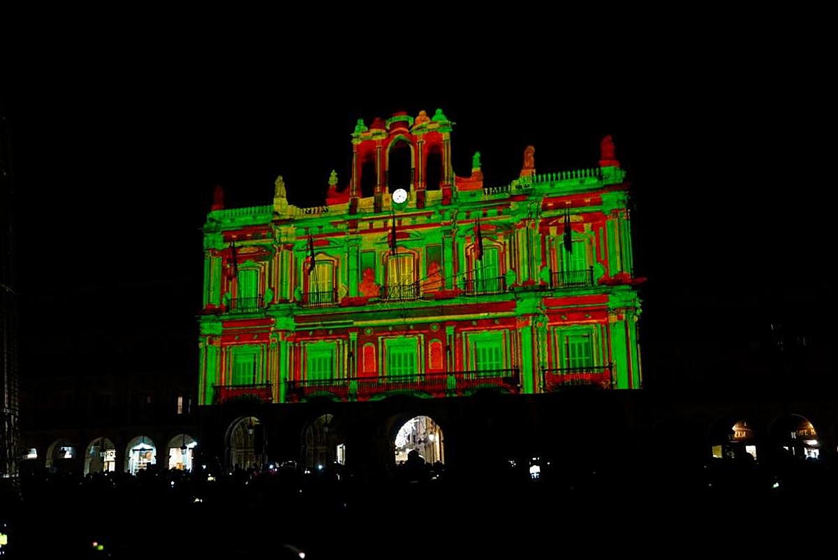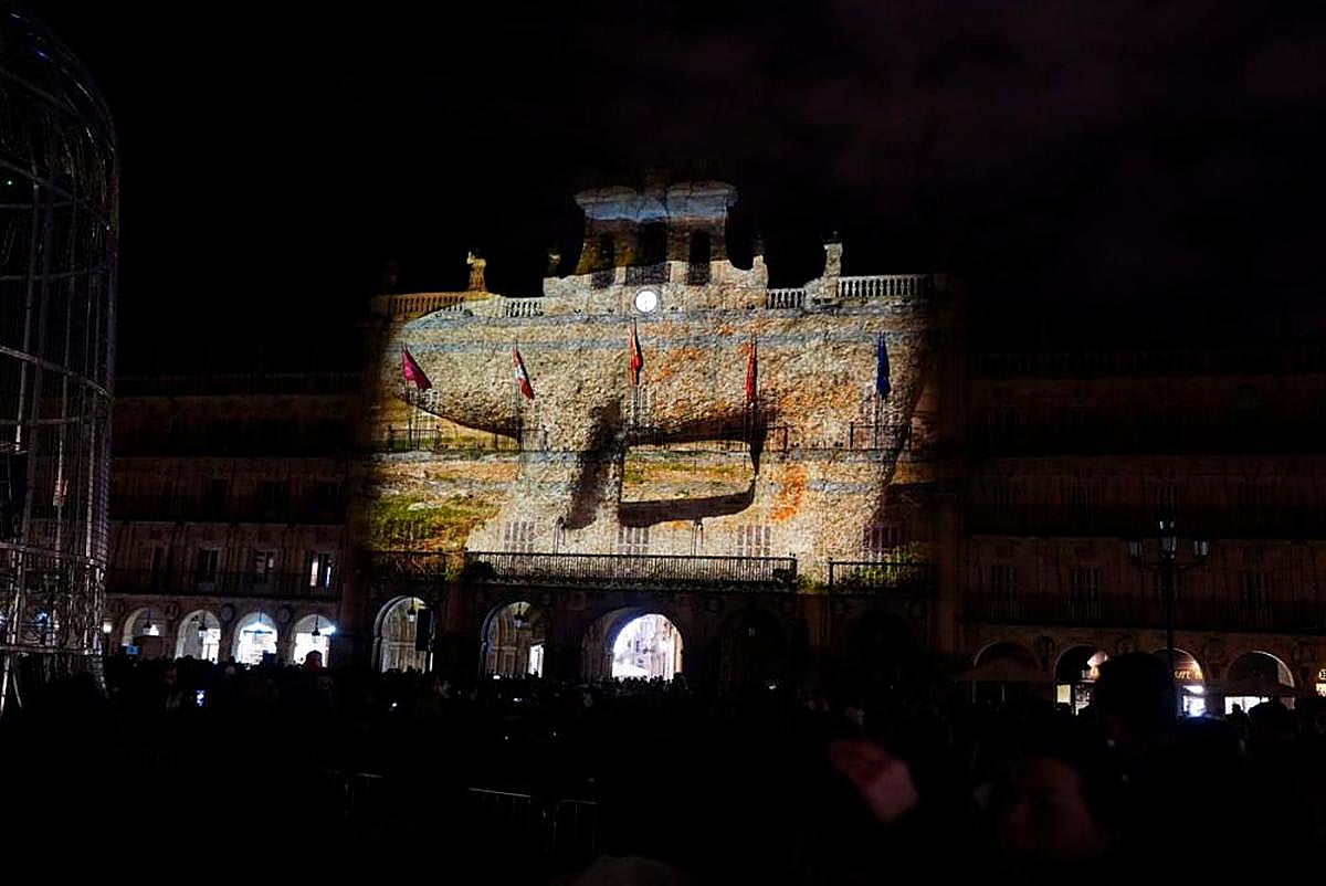 El espectáculo de luz y sonido, que se proyectó sobre la fachada del Ayuntamiento, contó parte de la historia de la provincia charra y sus alrededores. Uno de los protagonistas fue el verraco del Puente Romano, que dejó una de las imágenes más espectaculares de la noche.
