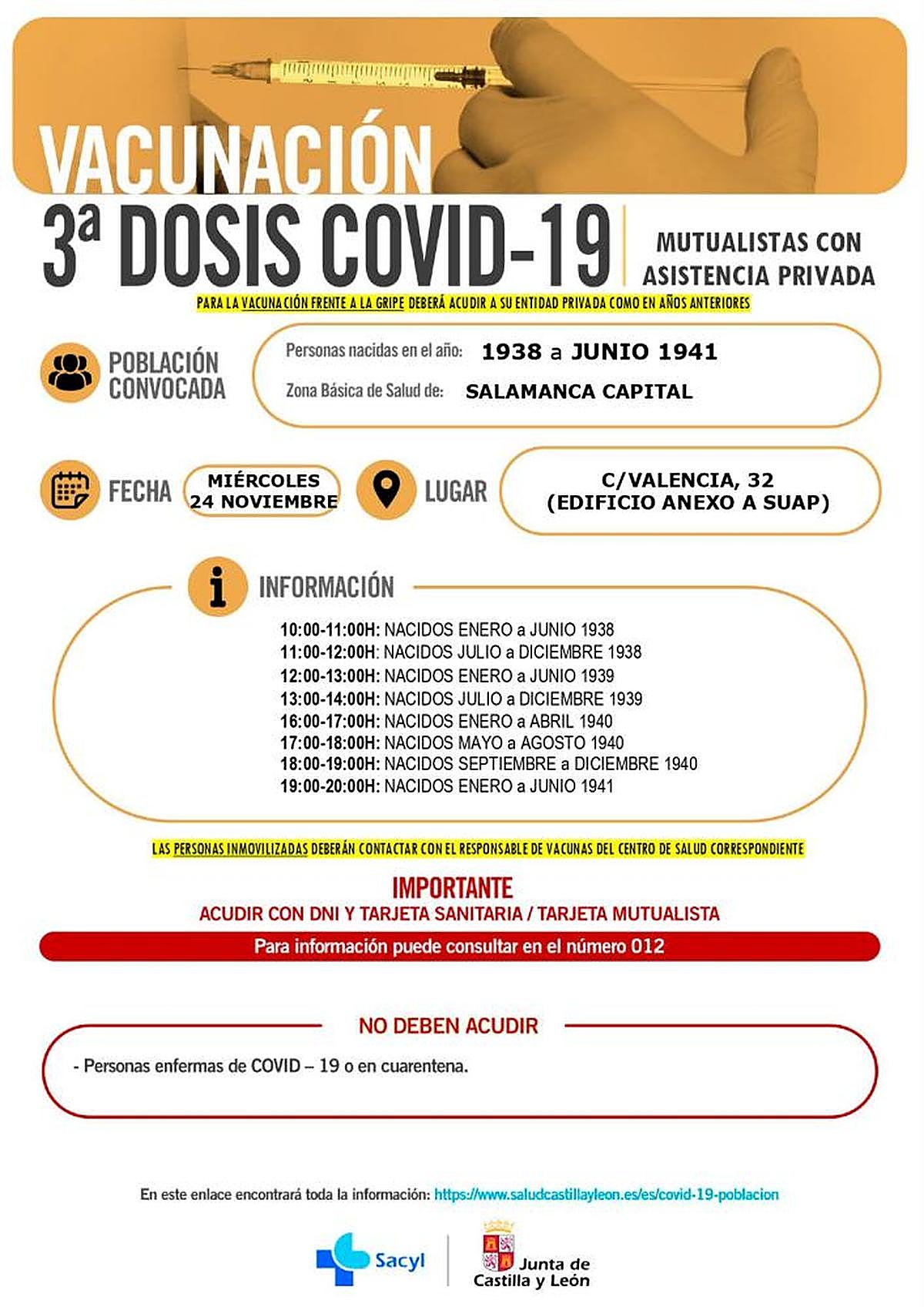 Los mutualistas salmantinos que reciben asistencia sanitaria a través de clínicas privadas recibirán la tercera dosis de la vacuna frente al covid entre el 22 de y el 30 de noviembre, en función de su año de nacimiento.
