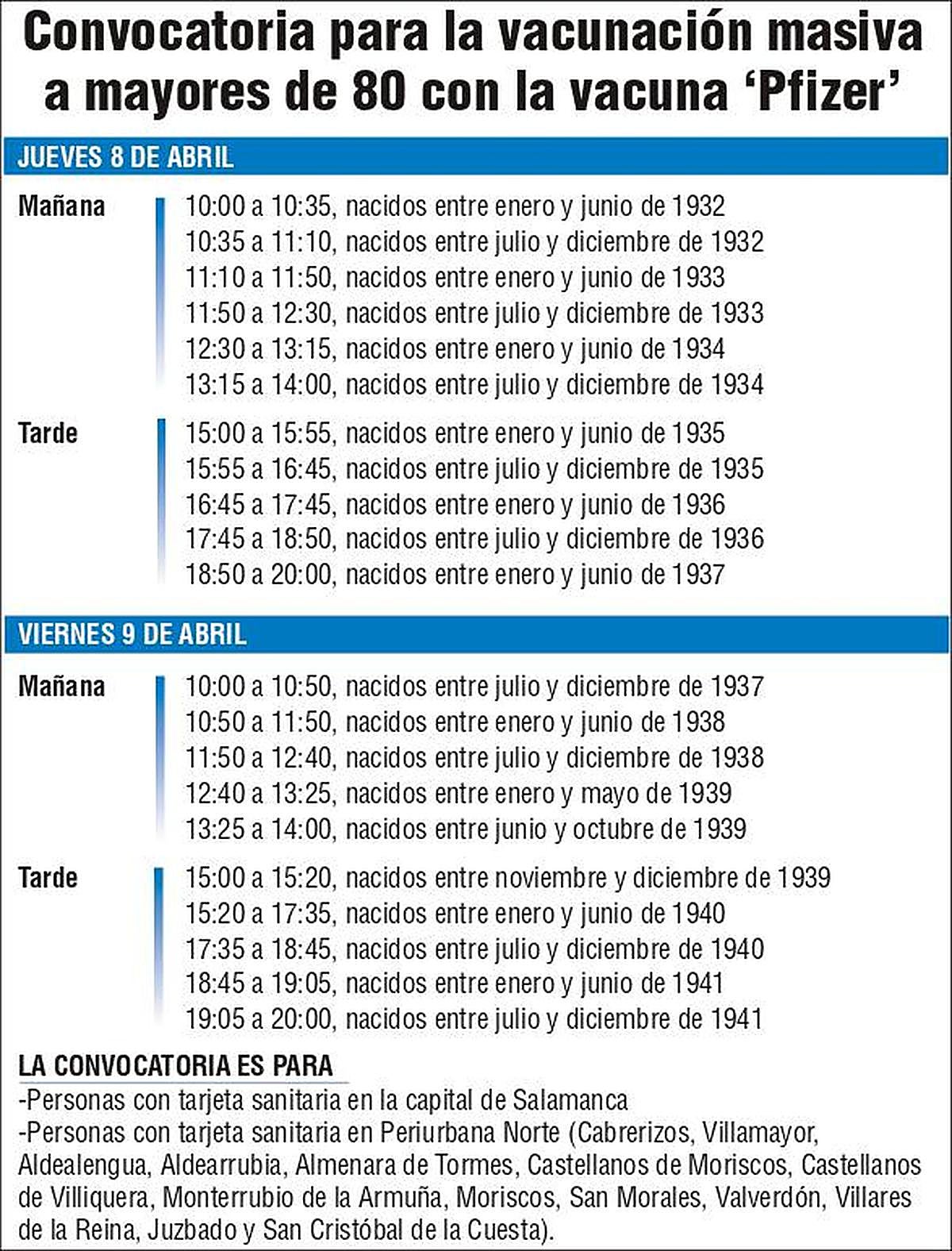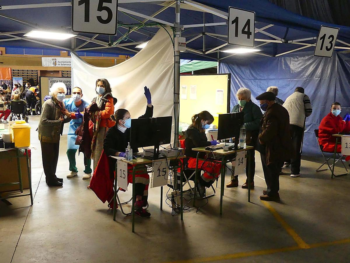 Grandes colas a las puertas del Multiusos Sánchez Paraíso en la segunda jornada de vacunación masiva contra el coronavirus en Salamanca. Hasta 8.200 mayores de 80 años desfilarán entre este jueves (3.900) y el viernes (4.300). Son personas entre 80 y 89 años que tienen su tarjeta sanitaria en la capital o en los pueblos de Periurbana Norte y que deben acudir a la hora que les corresponde en función de su fecha de nacimiento (consultar gráfico de la derecha), pero no serán telefoneados para citarles como sí se hizo con los mayores de 90 o los grandes dependientes.