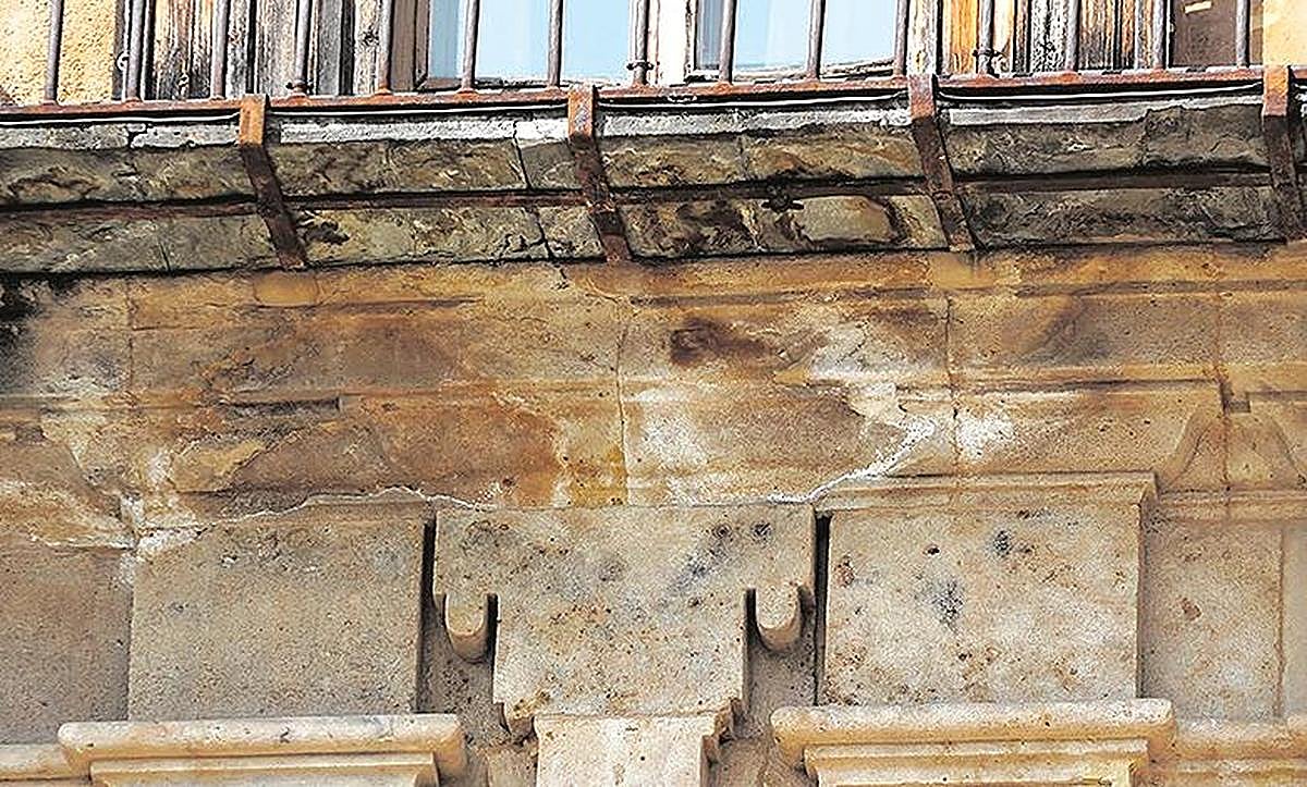 Según explican los técnicos, la pérdida de la capa de impermeabilización que poseía la pizarra de los balcones favorece las filtraciones y, por ello, los sillares que se encuentran bajo ellos son los más afectados. También contribuye la pérdida de la pátina protectora de la arenisca. Así, la humedad combinada con las sales solubles que se depositan en la piedra contribuyen a la aparición de las manchas, que se evidencian más durante los meses de calor.