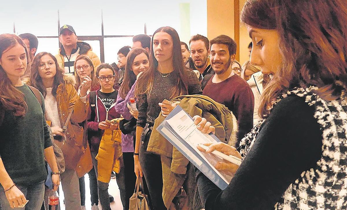 Con una puntualidad escrupulosa, a las 15:30 se abrieron las aulas de Derecho y los supervisores del examen comenzaron a citar a los aspirantes por su nombre y apellidos. Silencio en los pasillos, creyentes que se santiguan y hasta un morreo de despedida para desear buena suerte o, al menos, entrar al aula con buen sabor de boca.