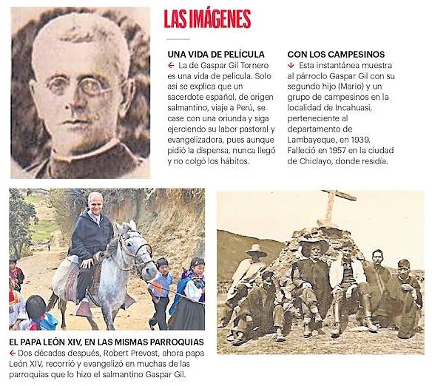 Pero nunca llegó a colgar los hábitos, sino que en su día a día no escatimó esfuerzos ni compromiso por buscar el bienestar de los miembros de sus parroquias, especialmente en su destino en tierras peruanas, donde ejerció como sacerdote en diferentes y recónditas localidades del departamento de Lambayeque, caminos polvorientos que años después recorrió el agustino Robert Prevost, hoy papa León XIV, en su condición de misionero y después como obispo. «Gaspar Gil es uno de esos párrocos que como León XIV ejercieron con abnegación su ministerio sacerdotal», señala su nieta Cecilia Gil de Castritius (residente en Alemania), consciente de que esta circunstancia bien merecía un homenaje a este párroco de origen salmantino (y a otros como él) que preparó el camino para que dos décadas después de su fallecimiento el ahora papa León XIV ejerciera su labor misionera en esas mismas tierras peruanas (Piura, Chulucanas, Trujillo y Chiclayo) entre los años 1982 y 2023.