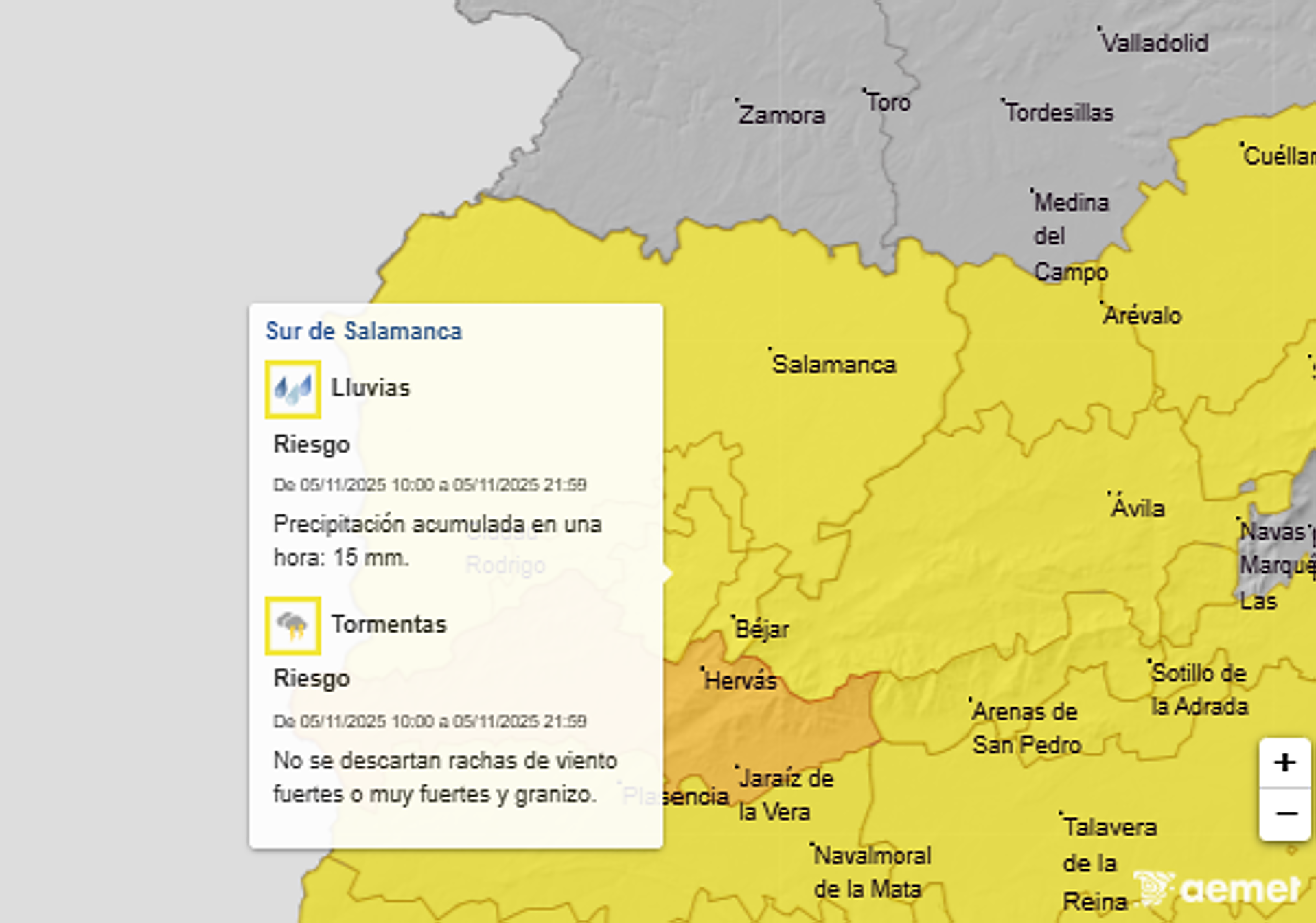 En cuanto a la región denominada como Sur de Salamanca, donde se sitúan pueblos como Los Santos, el aviso amarillo es por lluvias, que podrán acumular hasta 15 mm en una hora, y tormentas que no se descarta que puedan ir acompañadas de viento. Ambos avisos permanecerán hasta las 21:59 horas.