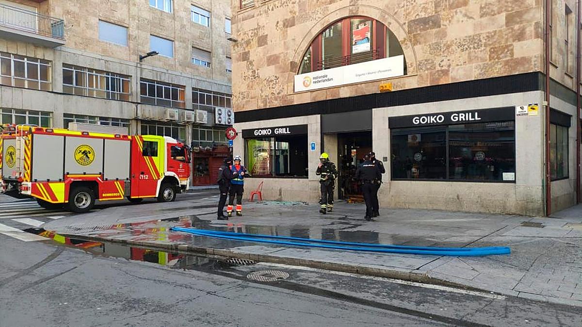 Un hombre de 23 años ha resultado herido con quemaduras en la cara este miércoles a consecuencia del fuego originado en la cocina de una céntrica hamburguesería de la capital salmantina. Según informa el servicio de emergencias 112, el suceso se produjo a las 11:20 horas en el restaurante Goiko de la calle Correhuela, 18. El fuego se originó por la explosión de una de las freidoras de la cocina. Uno de los trabajadores resultó herido con quemaduras en el rostro. Concretamente tiene afectada una parte de la cara, y más concretamente la zona ocular. En esos momentos el restaurante se encontraba cerrado al público.