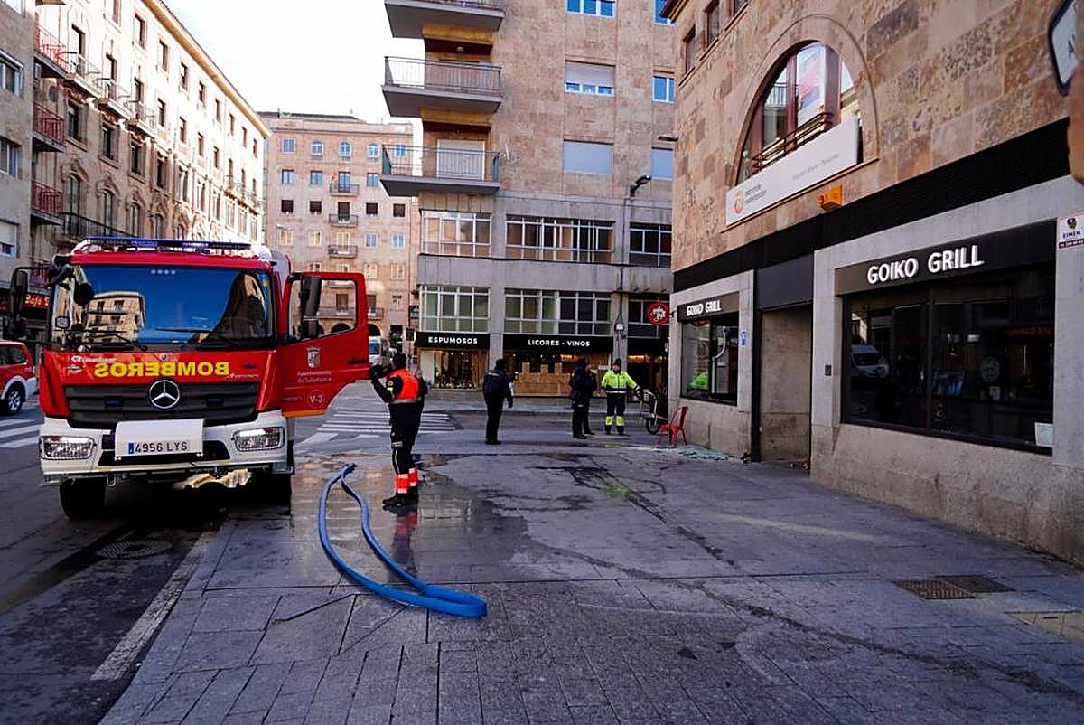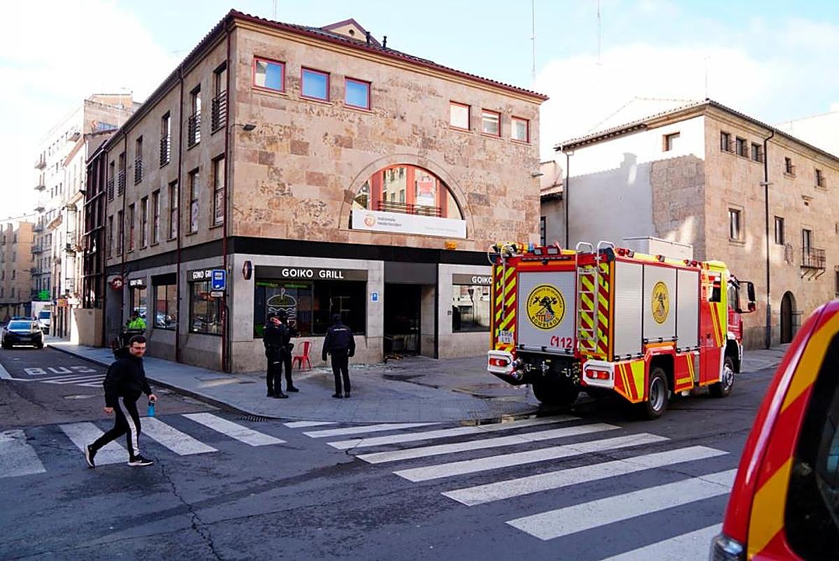 Hasta el lugar se han desplazado los bomberos del parque municipal, agentes de las policías Local y Nacional y una ambulancia de Sacyl que ha atendido al herido, que fue trasladado posteriormente al Complejo Asistencial de Salamanca en una UVI móvil. Los bomberos tuvieron que fracturar uno de los cristales del establecimiento para acceder a su interior ya que la puerta se encontraba cerrada en el momento del suceso.
