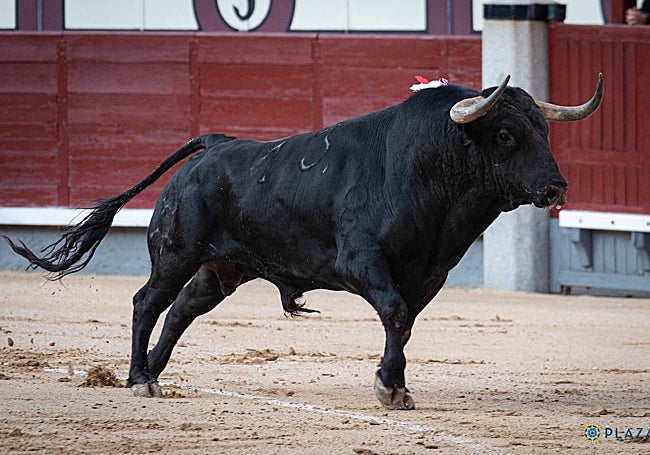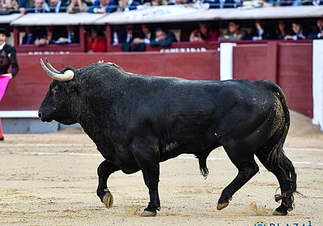 De Pedraza de Yeltes, nº 25, de 597 kilos, Colorado ojo de perdiz, nacido en septiembre de 2018. Lidiado en Madrid, el 24 de septiembre de 2023, por Gómez del Pilar, que perdió una oreja por fallar con la espada.