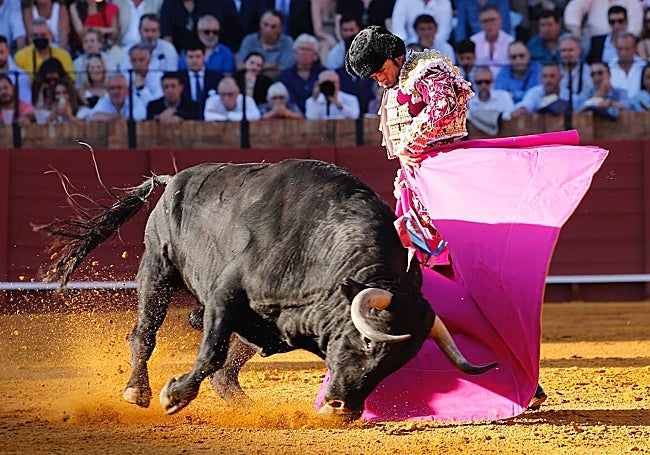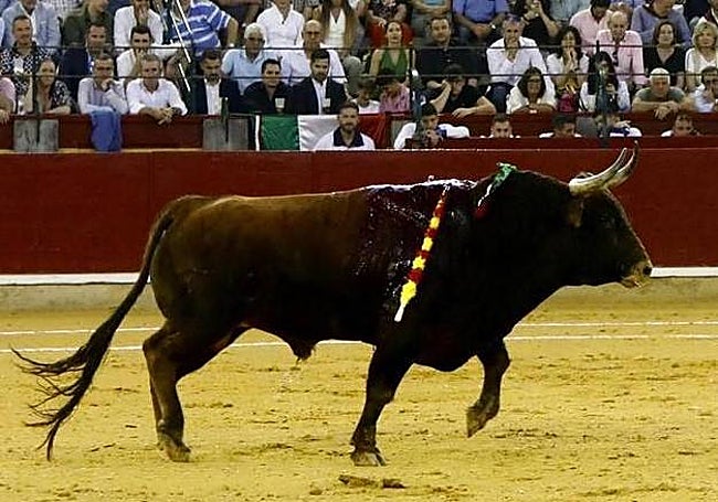De Olga Jiménez, nº 13, de 520 kilos, negro, nacido en noviembre de 2018. Lidiado en Sevilla, el 24 de abril de 2023. Talavante le cortó las dos orejas y salió por la puerta grande.